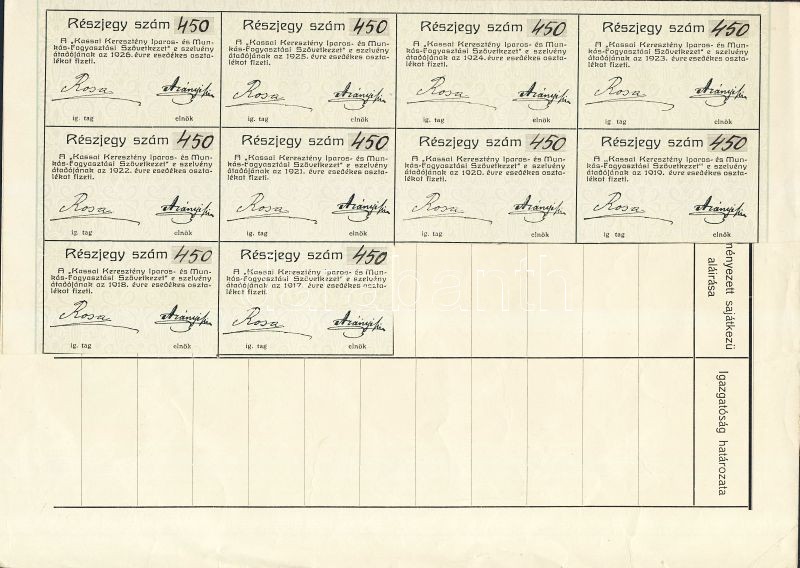 Beschreibung: 1911. "Kassai Keresztény Iparos- és Munkásfogyasztási Szövetkezet" részjegye 10K-ról, szelvényekkel