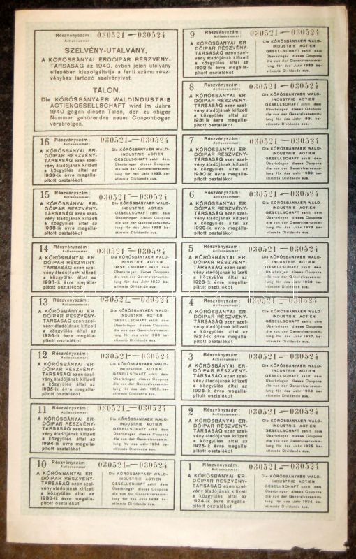 1924. "Körösbányai Erdőipar Részvénytársaság" részvénye 32 svájci Fran... https://www.darabanth.com/de/95-Fernauktion/95.0/Numismatik/~377/1924-Korosbanyai-Erdoipar-Reszvenytarsasag-reszvenye-32-svajci-Frankrol-3-nyleven-s~II216992