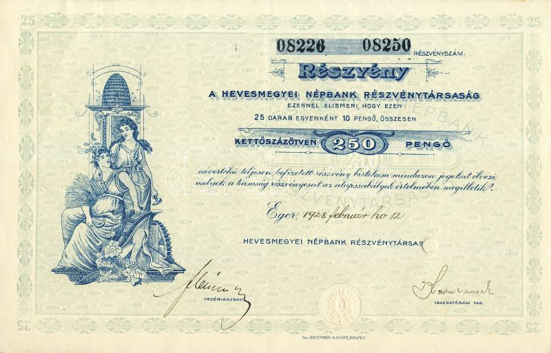 1928. "Hevesmegyei Népbank Részvénytársaság" részvénye 250P-ről, szelv... https://www.darabanth.com/de/95-Fernauktion/95.0/Numismatik/~377/1928-Hevesmegyei-Nepbank-Reszvenytarsasag-reszvenye-250P-rol-szelvenyekkel~II216989