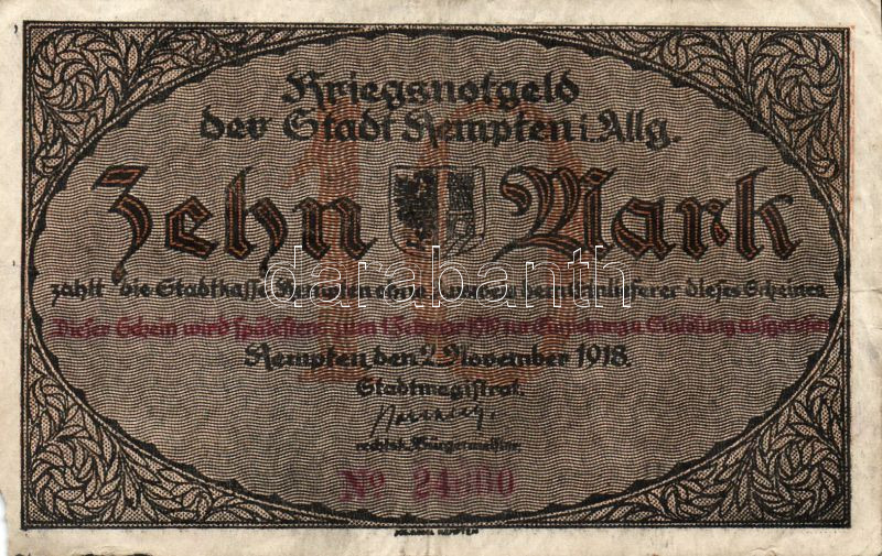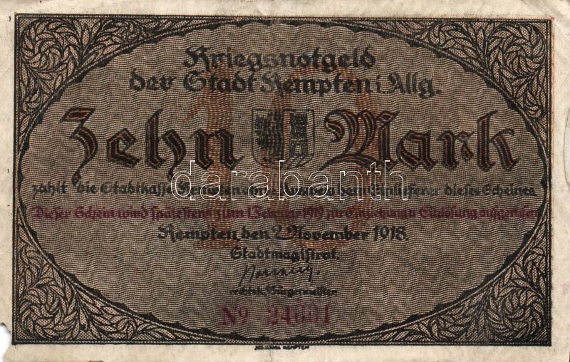 Német Birodalom/Császárság/ Kempten 1918. 10M (2x) egymásutáni sorszám... https://www.darabanth.com/de/95-Fernauktion/95.0/Numismatik/~379/Nemet-BirodalomCsaszarsag-Kempten-1918-10M-2x-egymasutani-sorszammal-TII-III-~II215017