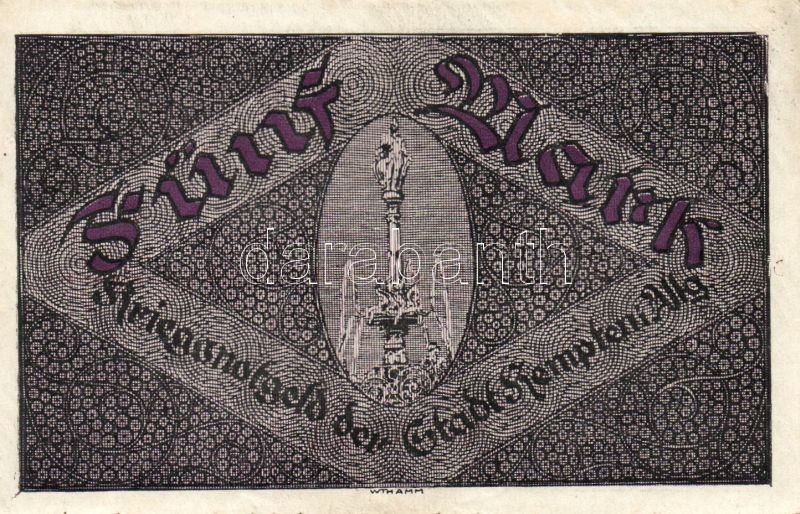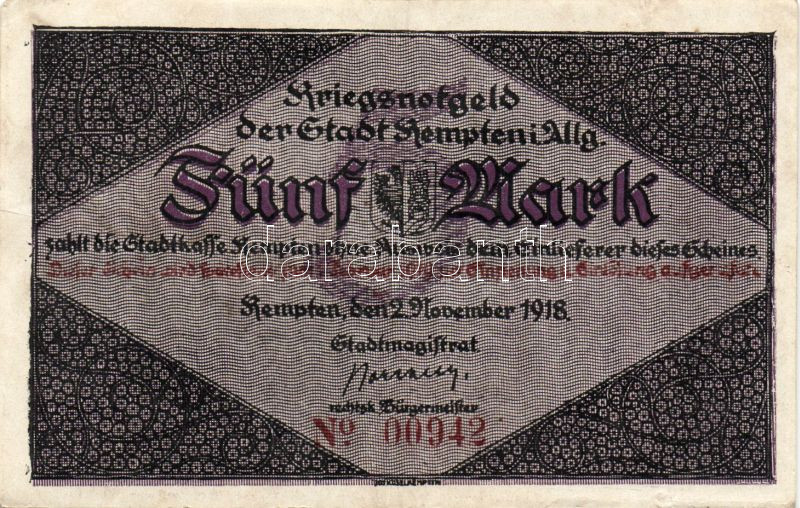 Német Birodalom/Császárság/ Kempten 1918. 5M(2x) egymásutáni sorszámma... https://www.darabanth.com/de/95-Fernauktion/95.0/Numismatik/~379/Nemet-BirodalomCsaszarsag-Kempten-1918-5M2x-egymasutani-sorszammal-TII~II215002