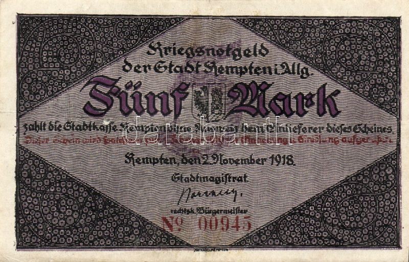 Beschreibung: Német Birodalom/Császárság/ Kempten 1918. 5M(2x) egymásutáni sorszámmal T:II