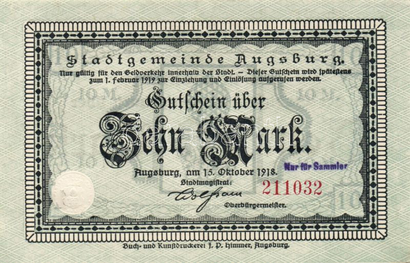 Beschreibung: Német Birodalom/Császárság/Augsburg 1918. 10M hivatalos érvénytelenítéssel T:I