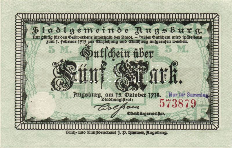Beschreibung: Német Birodalom/Császárság/Augsburg 1918. 5M hivatalos érvénytelenítéssel T:I