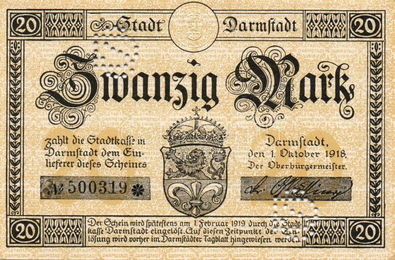 Német Birodalom/Császárság/Darmstadt 1918.10.1. 20M T:I https://www.darabanth.com/de/95-Fernauktion/95.0/Numismatik/~379/Nemet-BirodalomCsaszarsagDarmstadt-1918101-20M-TI~II219924