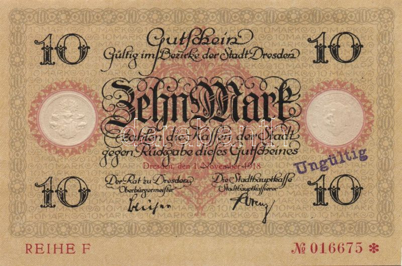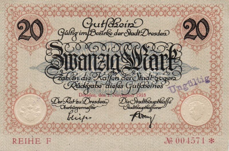 Beschreibung: Német Birodalom/Császárság/Dresden 1918.11.1. 10M, 20M hivatalos érvénytelenítéssel T:I,I-