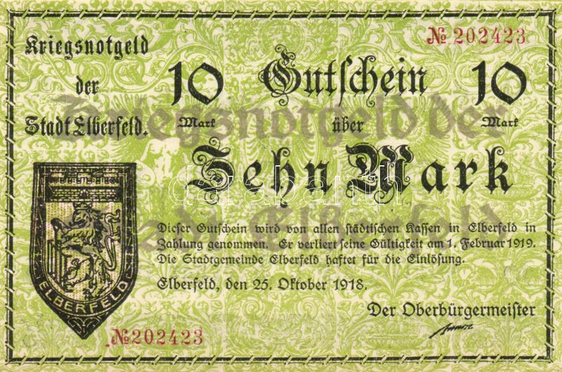 Beschreibung: Német Birodalom/Császárság/Elberfeld 1918.10.25. 10M T:I-