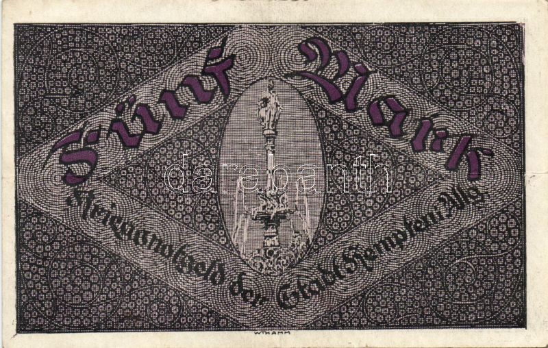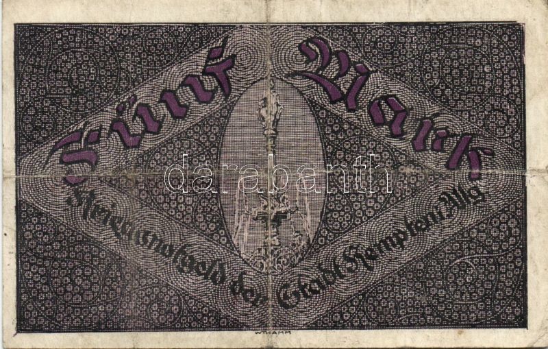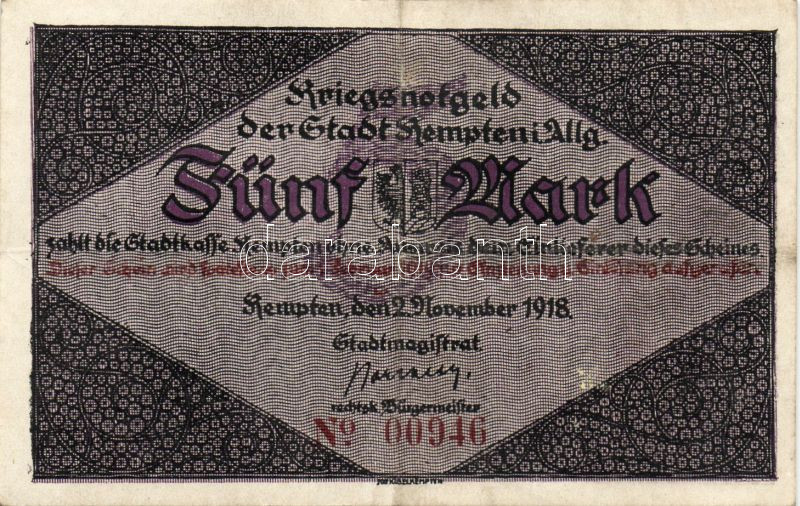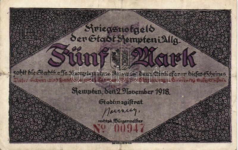 Német Birodalom/Császárság/Kempten 1918. 5M(2x) egymásutáni sorszámmal... https://www.darabanth.com/de/95-Fernauktion/95.0/Numismatik/~379/Nemet-BirodalomCsaszarsagKempten-1918-5M2x-egymasutani-sorszammal-TII~II215005