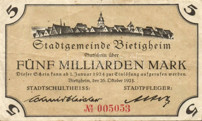 Német Birodalom/Weimari Köztársaság/ Bietigheim 1923. 5000.000.000M T:... https://www.darabanth.com/de/95-Fernauktion/95.0/Numismatik/~379/Nemet-BirodalomWeimari-Koztarsasag-Bietigheim-1923-5000000000M-TII~II215150