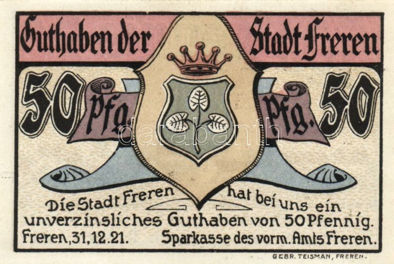 Német Birodalom/Weimari Köztársaság/ Freren 1921. 50Pf + 75Pf + 1M 3kl... https://www.darabanth.com/de/95-Fernauktion/95.0/Numismatik/~379/Nemet-BirodalomWeimari-Koztarsasag-Freren-1921-50Pf-plus-75Pf-plus-1M-3klf-db-teljes-sor-TI~II219426