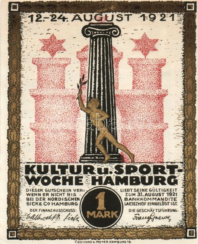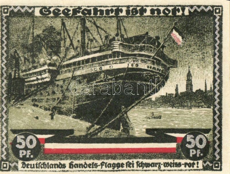 Beschreibung: Német Birodalom/Weimari Köztársaság/ Hamburg 1921. 50Pf(ezüst nyomással) + 1M(arany nyomással) 2klf db T:I