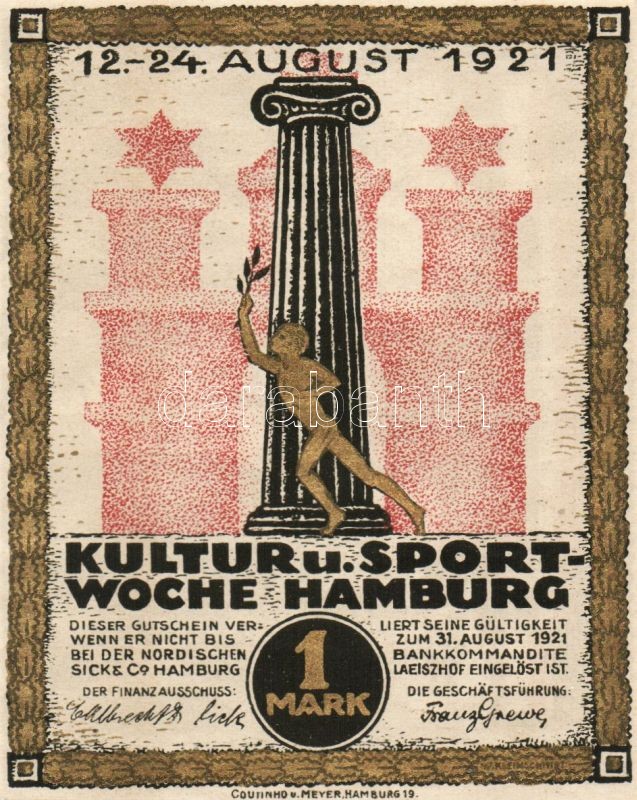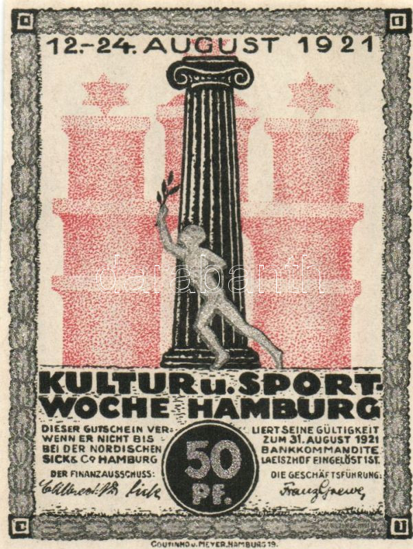 Beschreibung: Német Birodalom/Weimari Köztársaság/ Hamburg 1921. 50Pf(ezüst nyomással) + 1M(arany nyomással) 2klf db T:I
