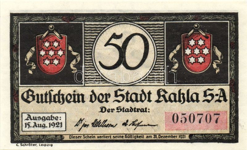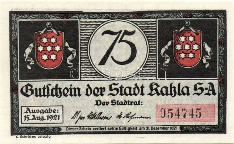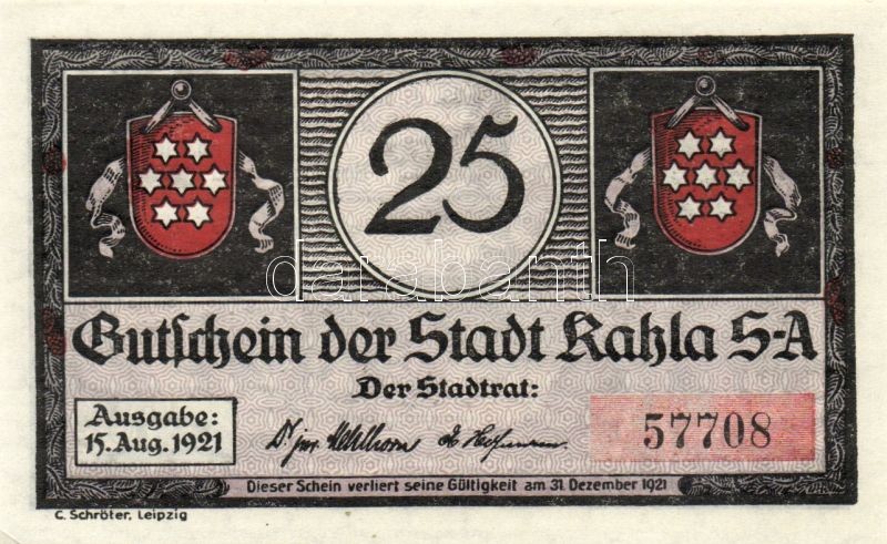 Német Birodalom/Weimari Köztársaság/ Kahla 1921. 25Pf + 50Pf + 75Pf 3k... https://www.darabanth.com/de/95-Fernauktion/95.0/Numismatik/~379/Nemet-BirodalomWeimari-Koztarsasag-Kahla-1921-25Pf-plus-50Pf-plus-75Pf-3klf-db-teljes-sor-TI~II219391