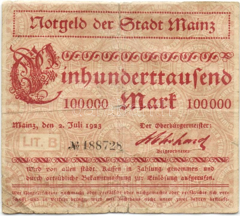 Német Birodalom/Weimari Köztársaság/ Mainz 1923.7.2. 100.000M T:III/IV https://www.darabanth.com/de/95-Fernauktion/95.0/Numismatik/~379/Nemet-BirodalomWeimari-Koztarsasag-Mainz-192372-100000M-TIIIIV~II215403