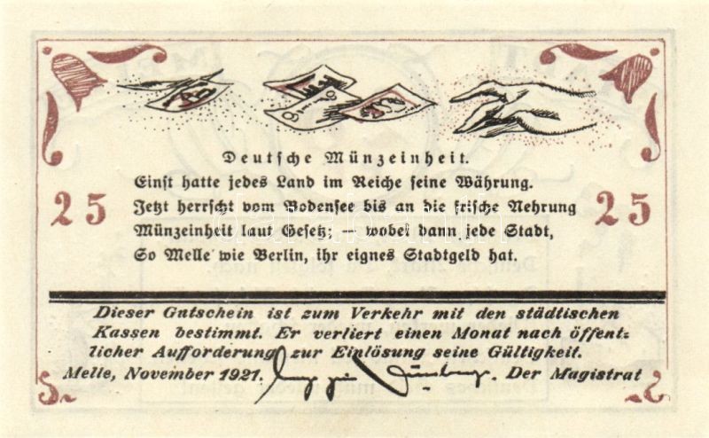 Beschreibung: Német Birodalom/Weimari Köztársaság/ Melle 1921. 10Pf(2x) 25Pf(2x) + 50Pf(2x) 6klf db, teljes sor T:I