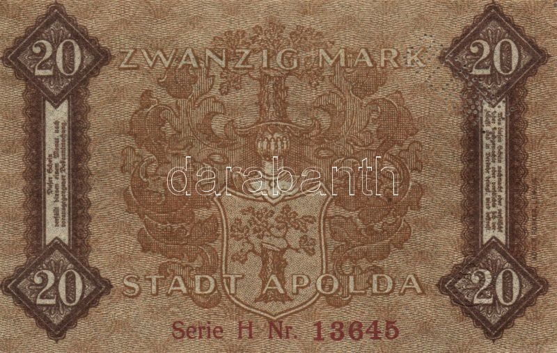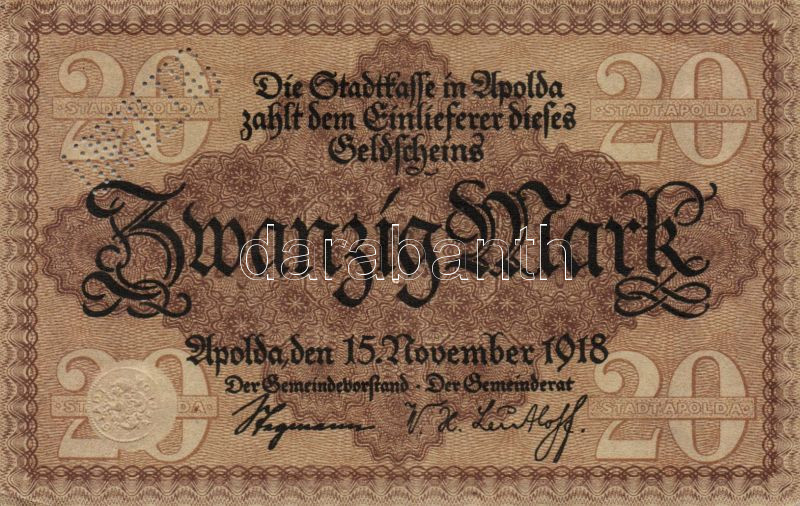 Beschreibung: Német Birodalom/Weimari Köztársaság/Apolda 1918. 20M hivatalos érvénytelenítéssel T:II
