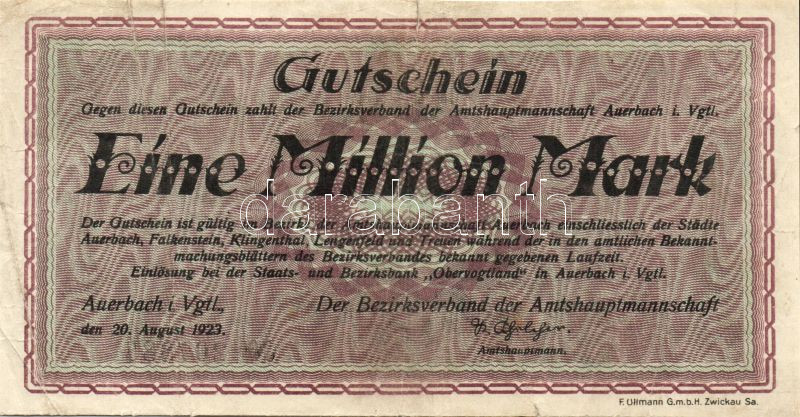Német Birodalom/Weimari Köztársaság/Auerbach i. Vgtl. 1923.8.20. 1000.... https://www.darabanth.com/de/95-Fernauktion/95.0/Numismatik/~379/Nemet-BirodalomWeimari-KoztarsasagAuerbach-i-Vgtl-1923820-1000000M-TIII~II219782