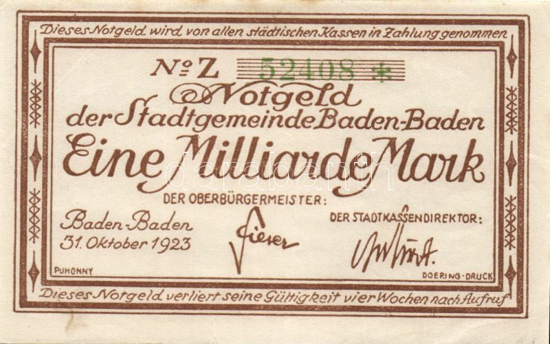 Beschreibung: Német Birodalom/Weimari Köztársaság/Baden-Baden 1923.10.31. 1000.000.000M sorszám variáns T:I- foltos