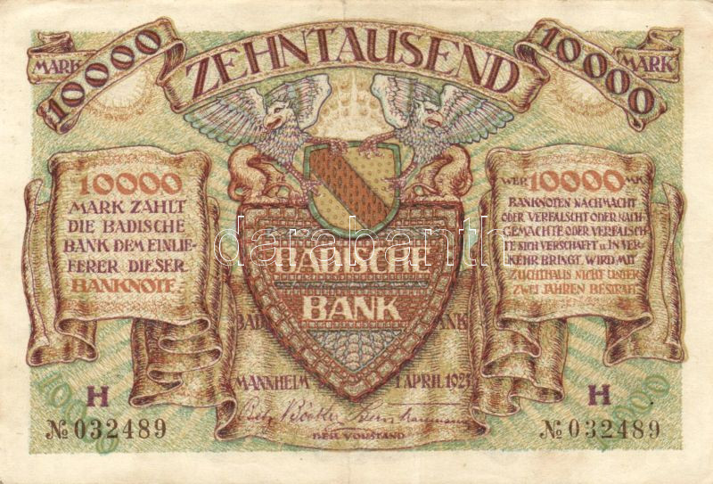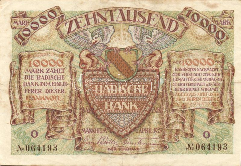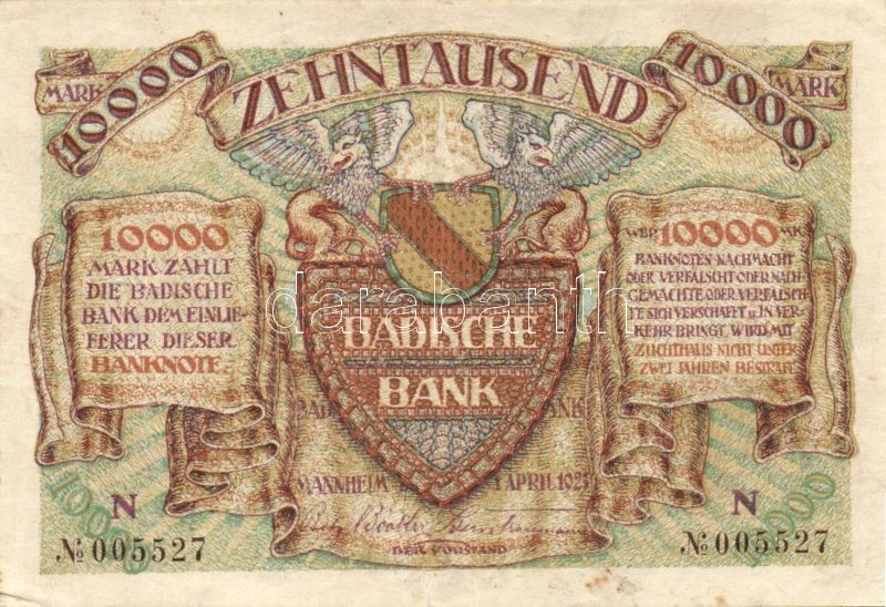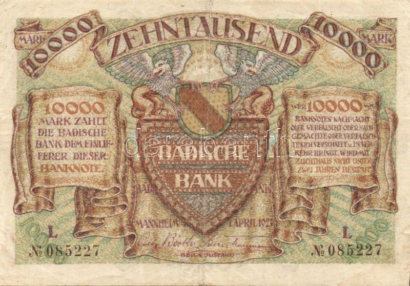 Német Birodalom/Weimari Köztársaság/Baden/Badische Bank 1923. 10.000M ... https://www.darabanth.com/de/95-Fernauktion/95.0/Numismatik/~379/Nemet-BirodalomWeimari-KoztarsasagBadenBadische-Bank-1923-10000M-4x-klf-szeriabetukkel-~II219602