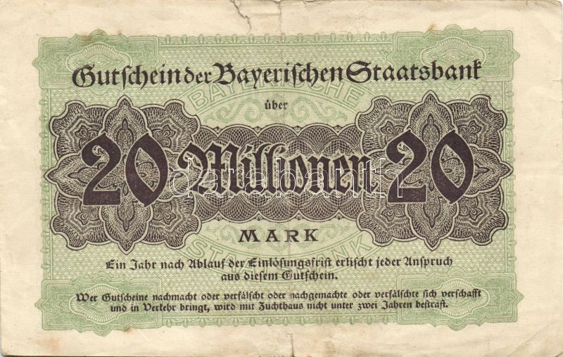 Beschreibung: Német Birodalom/Weimari Köztársaság/Bajorország/Bayerische Staatsbank, München 1923. 20.000.000M T:III