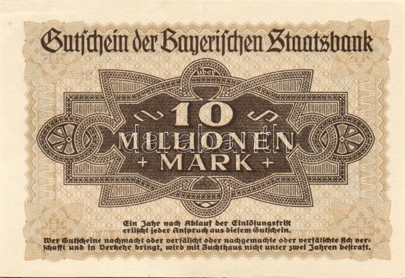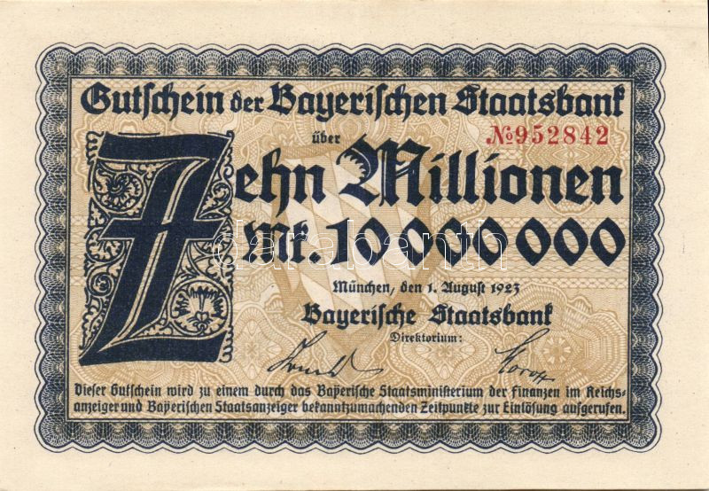 Beschreibung: Német Birodalom/Weimari Köztársaság/Bajorország/Bayerischen Staatsbank, München 1923. 10.000.000M T:I- Kis saroktörés!