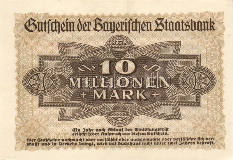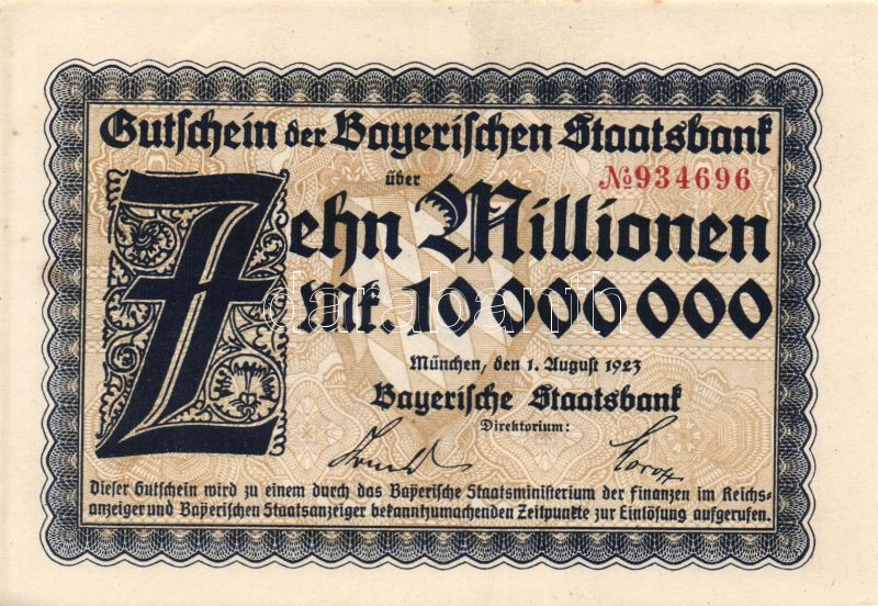 Beschreibung: Német Birodalom/Weimari Köztársaság/Bajorország/Bayerischen Staatsbank, München 1923. 10.000.000M T:I