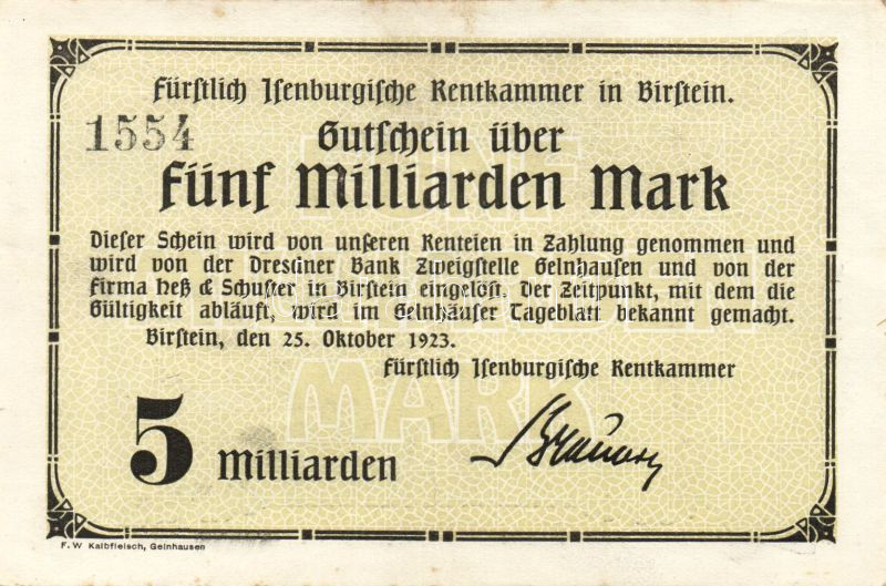 Beschreibung: Német Birodalom/Weimari Köztársaság/Birstein 1923.10.25. 5000.000.000M T:II