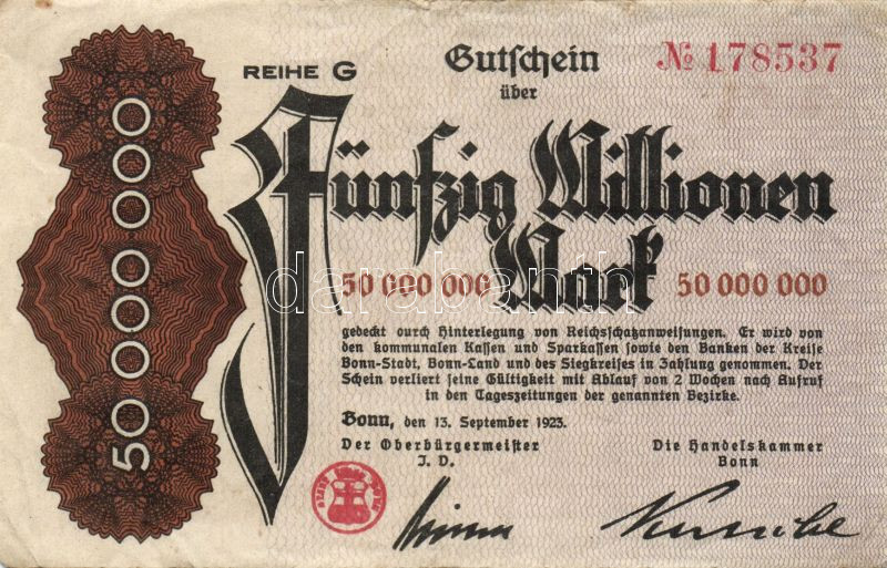Német Birodalom/Weimari Köztársaság/Bonn 1923.9.13. 50.000.000M T:II- https://www.darabanth.com/de/95-Fernauktion/95.0/Numismatik/~379/Nemet-BirodalomWeimari-KoztarsasagBonn-1923913-50000000M-TII-~II219891
