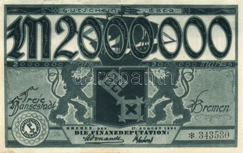 Német Birodalom/Weimari Köztársaság/Bremen 1923.8.17. 2000.000M T:II https://www.darabanth.com/de/95-Fernauktion/95.0/Numismatik/~379/Nemet-BirodalomWeimari-KoztarsasagBremen-1923817-2000000M-TII~II219893