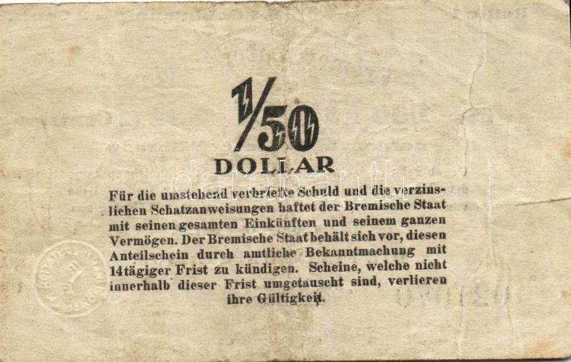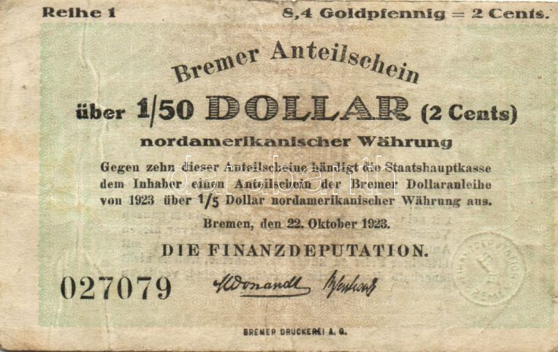 Beschreibung: Német Birodalom/Weimari Köztársaság/Bremen/Finanzdeputation, Bremer Anteilscheine 1923. 1/50$(2c) T:III