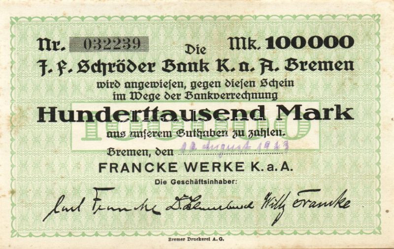 Beschreibung: Német Birodalom/Weimari Köztársaság/Bremen/Francke Werke K.a.K. 1923.8.10. 100.000M T:I- foltos