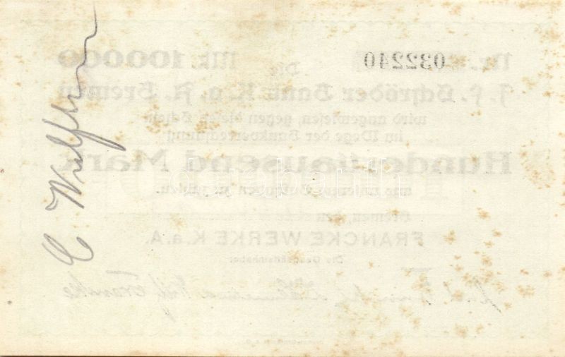Német Birodalom/Weimari Köztársaság/Bremen/Francke Werke K.a.K. 1923.8... https://www.darabanth.com/de/95-Fernauktion/95.0/Numismatik/~379/Nemet-BirodalomWeimari-KoztarsasagBremenFrancke-Werke-KaK-1923810-100000M-TI-foltos~II219894