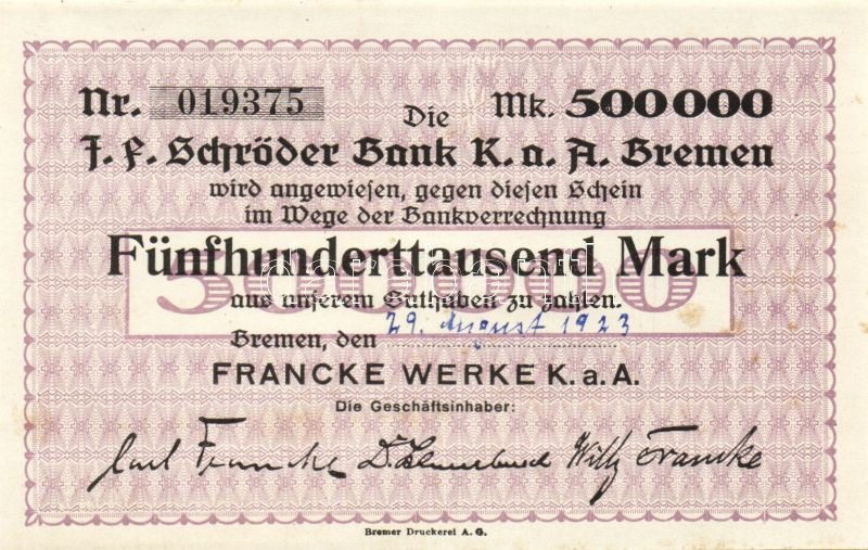 Beschreibung: Német Birodalom/Weimari Köztársaság/Bremen/Francke Werke K.a.K. 1923.8.29. 500.000M T:I- kissé foltos