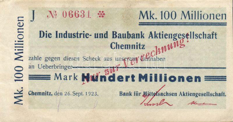 Beschreibung: Német Birodalom/Weimari Köztársaság/Chemnitz/Darmstädter und Nationalbank 1923.9.25. 100.000.000M T:II