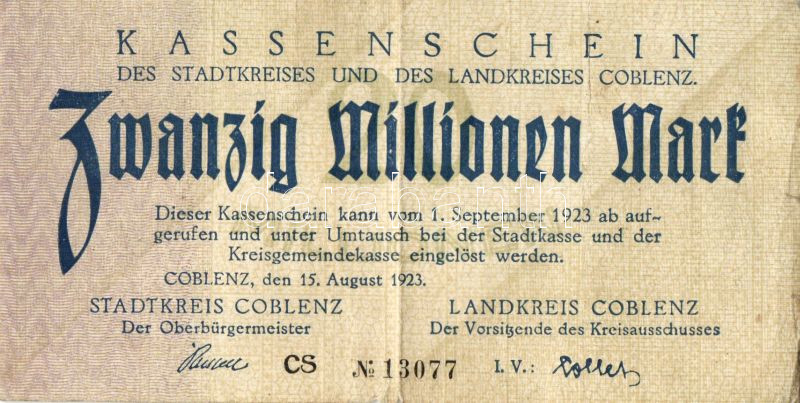 Német Birodalom/Weimari Köztársaság/Coblenz/Stadtkreis und Landkreis 1... https://www.darabanth.com/de/95-Fernauktion/95.0/Numismatik/~379/Nemet-BirodalomWeimari-KoztarsasagCoblenzStadtkreis-und-Landkreis-1923815-20000000M-TII~II219903