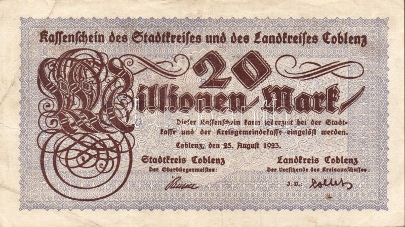 Német Birodalom/Weimari Köztársaság/Coblenz/Stadtkreis und Landkreis 1... https://www.darabanth.com/de/95-Fernauktion/95.0/Numismatik/~379/Nemet-BirodalomWeimari-KoztarsasagCoblenzStadtkreis-und-Landkreis-1923825-20000000M-TII~II219904
