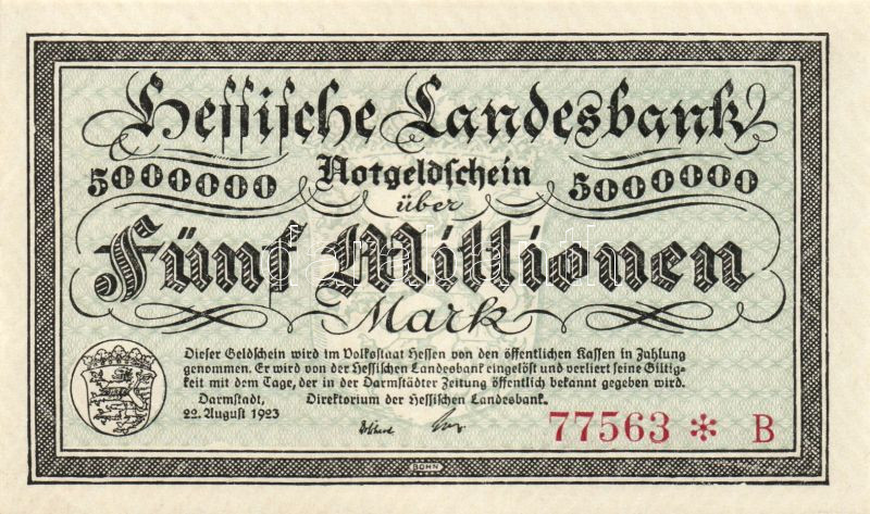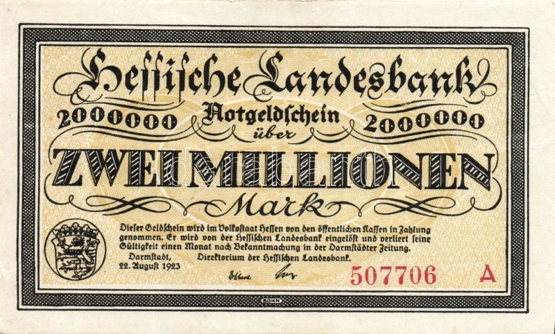 Német Birodalom/Weimari Köztársaság/Darmstadt/Hessische Landesbank 192... https://www.darabanth.com/de/95-Fernauktion/95.0/Numismatik/~379/Nemet-BirodalomWeimari-KoztarsasagDarmstadtHessische-Landesbank-1923822-2000000M-500000~II219925