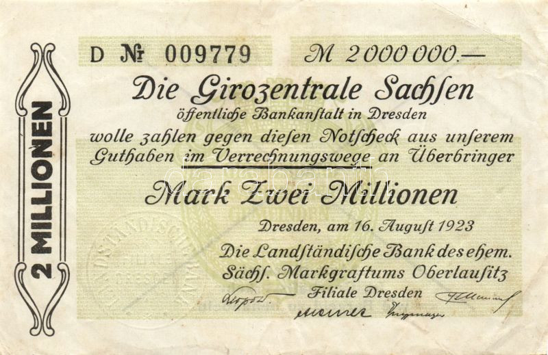Német Birodalom/Weimari Köztársaság/Dresden/Landständische Bank 1923.8... https://www.darabanth.com/de/95-Fernauktion/95.0/Numismatik/~379/Nemet-BirodalomWeimari-KoztarsasagDresdenLandstandische-Bank-1923816-2000000M-TII~II219976