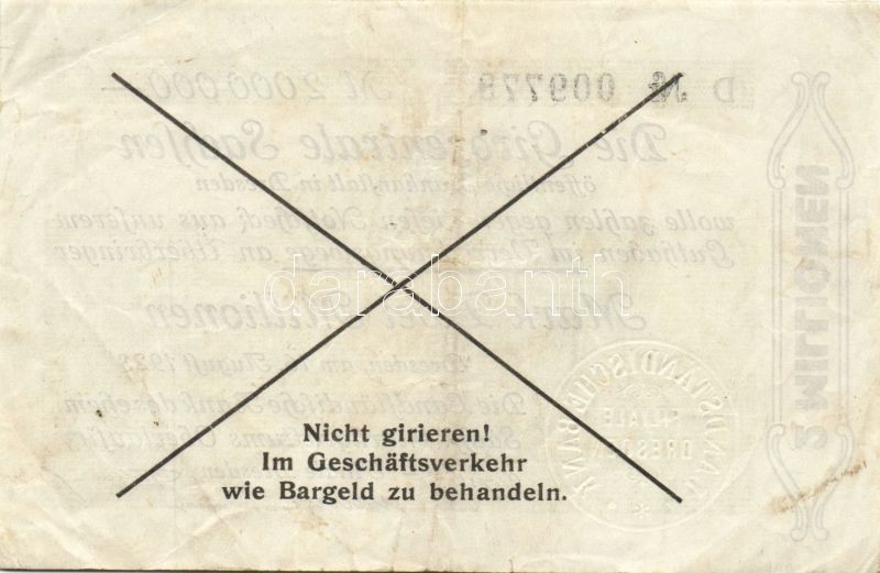Beschreibung: Német Birodalom/Weimari Köztársaság/Dresden/Landständische Bank 1923.8.16. 2000.000M T:II