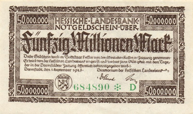 Beschreibung: Német Birodalom/Weimari Köztársaság/Hessen/Hessische Landesbank, Darmstadt 1923. 50.000.000M T:I