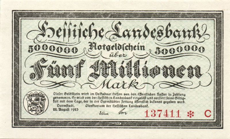 Beschreibung: Német Birodalom/Weimari Köztársaság/Hessen/Hessische Landesbank, Darmstadt 1923. 5000.000M T:I