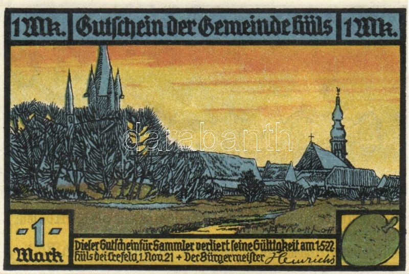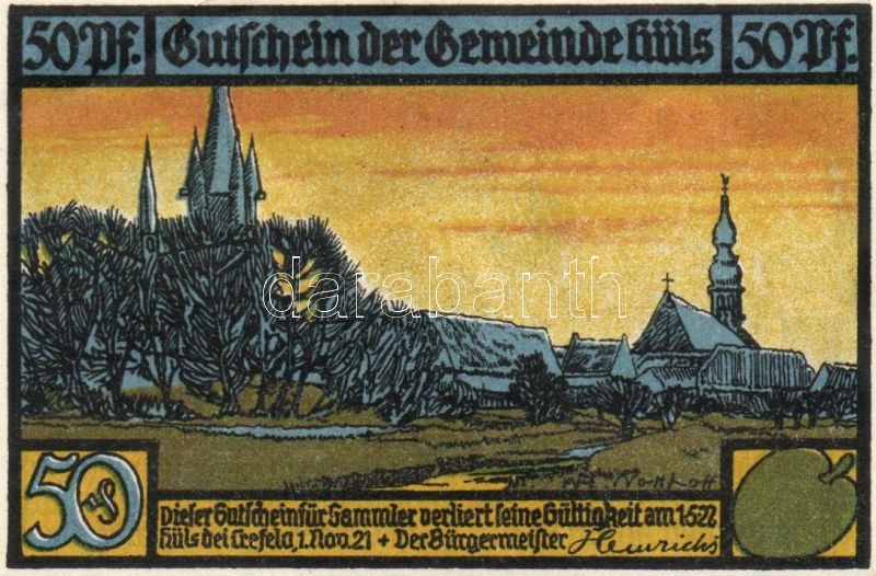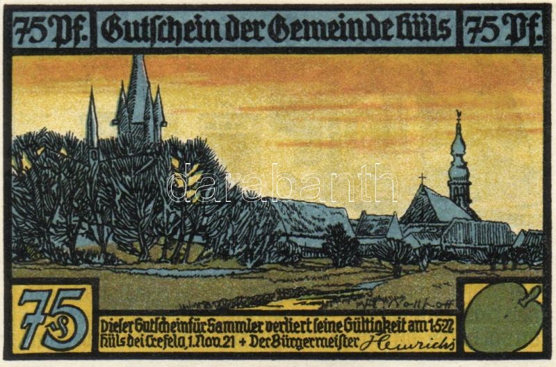 Beschreibung: Német Birodalom/Weimari Köztársaság/Hüls 1921. 50Pf + 75Pf + 1M 3klf db, teljes sor T:I