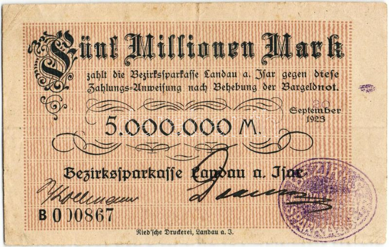 Beschreibung: Német Birodalom/Weimari Köztársaság/Landau Bezirkssparkasse 1923.9.20. 5000.000M T:II
