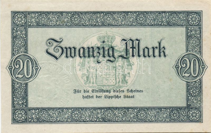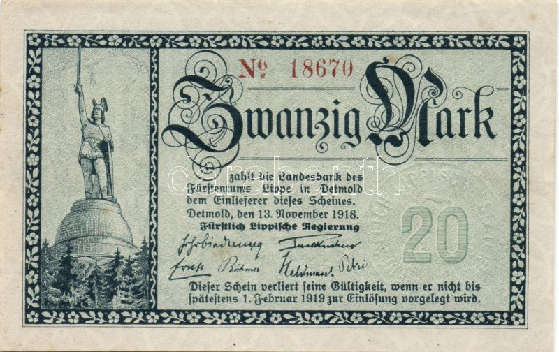 Beschreibung: Német Birodalom/Weimari Köztársaság/Lippe/Fürstlich Lippische Regierung, Detmold 1918.11.13. 20M T:I