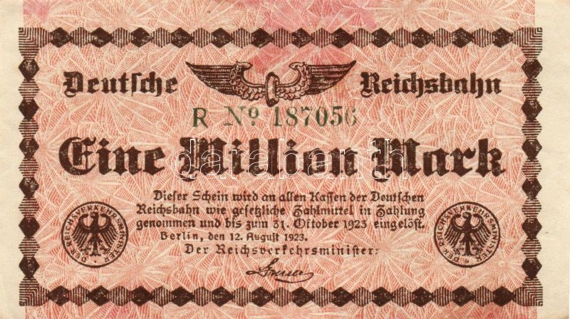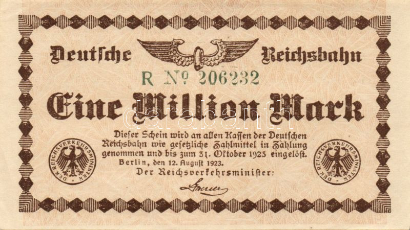 Német Birodalom/Weimari Köztársaság/Német Birodalmi Vasút/Berlin 1923.... https://www.darabanth.com/de/95-Fernauktion/95.0/Numismatik/~379/Nemet-BirodalomWeimari-KoztarsasagNemet-Birodalmi-VasutBerlin-1923-1000000M-alapnyomat-sz~II219800