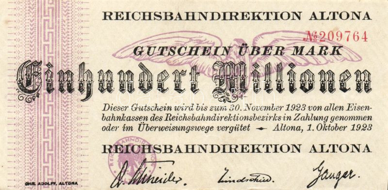Beschreibung: Német Birodalom/Weimari Köztársaság/Német Birodalmi Vasutak/Altona 1923. 100.000.000M T:II+ Csak egyszer hajtva, törve nem!