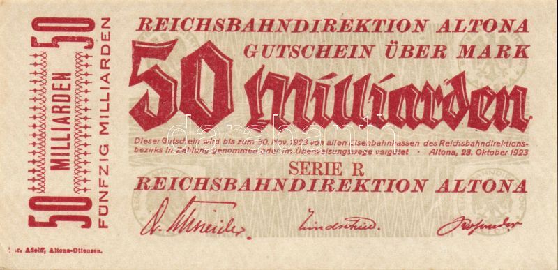 Beschreibung: Német Birodalom/Weimari Köztársaság/Német Birodalmi Vasutak/Altona 1923. 50.000.000.000M T:I- Pici sarokhajlás!