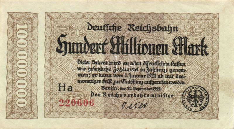 Beschreibung: Német Birodalom/Weimari Köztársaság/Német Birodalmi Vasutak/Berlin 1923. 100.000.000M (3x) klf szériabetűkkel T:I,II+