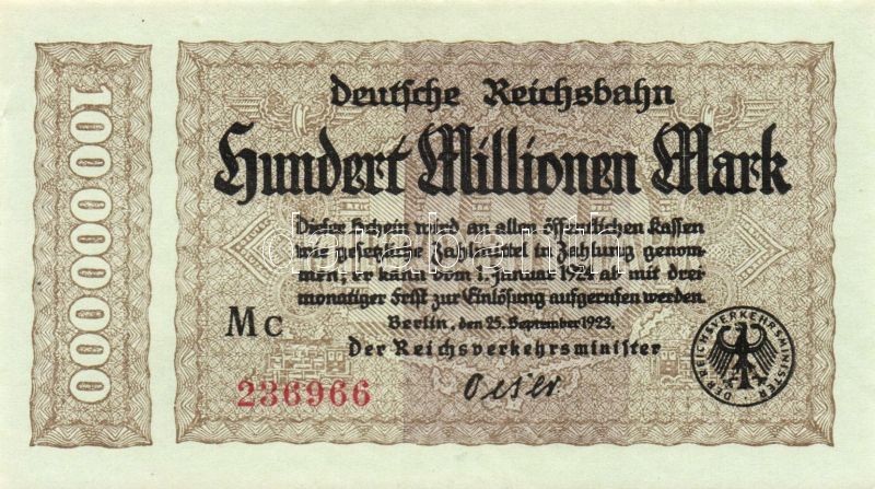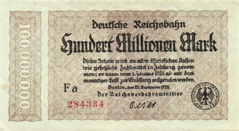 Német Birodalom/Weimari Köztársaság/Német Birodalmi Vasutak/Berlin 192... https://www.darabanth.com/de/95-Fernauktion/95.0/Numismatik/~379/Nemet-BirodalomWeimari-KoztarsasagNemet-Birodalmi-VasutakBerlin-1923-100000000M-3x-klf-~II219760