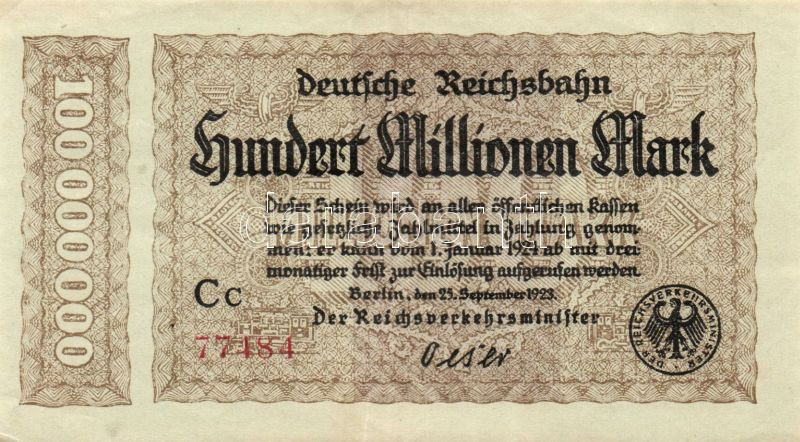 Német Birodalom/Weimari Köztársaság/Német Birodalmi Vasutak/Berlin 192... https://www.darabanth.com/de/95-Fernauktion/95.0/Numismatik/~379/Nemet-BirodalomWeimari-KoztarsasagNemet-Birodalmi-VasutakBerlin-1923-100000000M-sorszam-~II219731